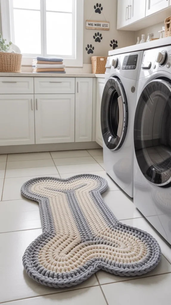 A dog bone pattern mat is a playful idea for laundry rooms or mudrooms. Repeating bone shapes in neutral or bright colors add fun to useful spaces that are often ignored. It turns a basic room into a cheerful area.