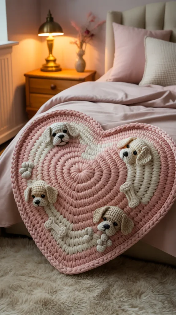 A puppy love heart mat mixes dog charm with heart shapes for a sweet and playful design. Red, pink, cream, or beige tones work well in bedrooms or cozy corners. It is a fun gift idea for couples who love pets.
