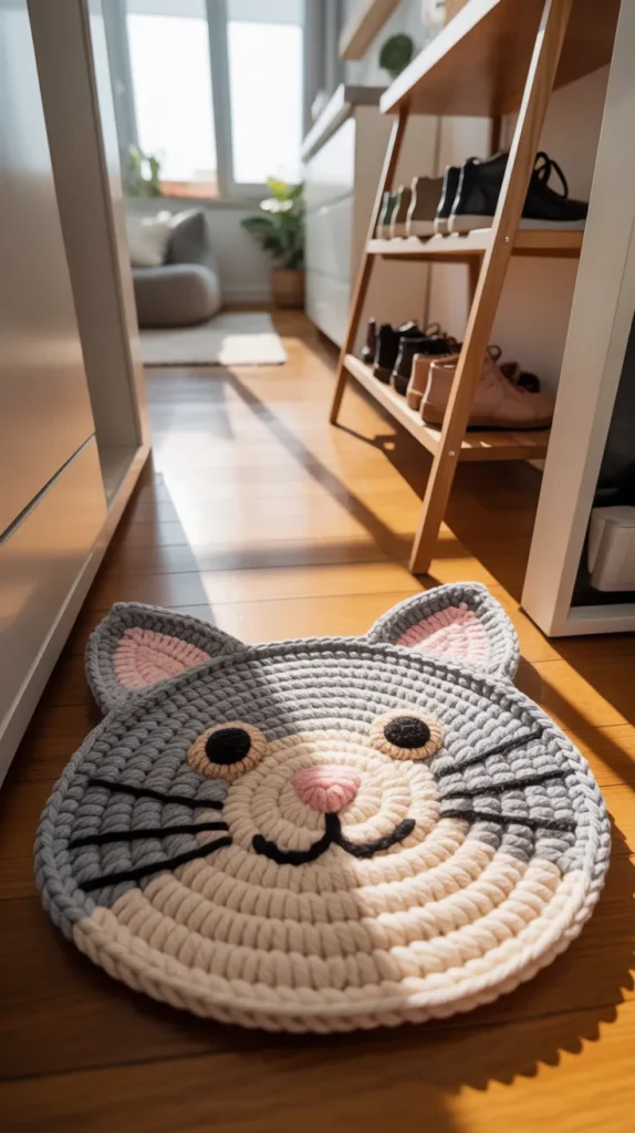 A cute cat face crochet mat is a charming way to welcome guests into your home. Soft gray, cream, white, or orange yarn colors can match many entryway styles. The round shape helps soften hard floor lines, while the cat face design adds playful personality. It works well in apartments, family homes, or small hallway spaces.