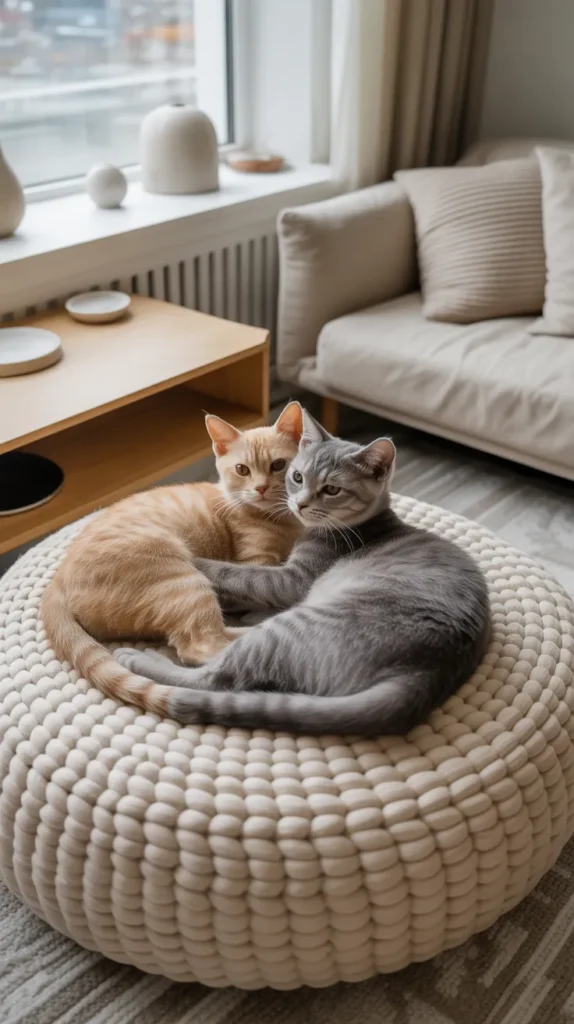 A twin cats round mat features two cute cats and works beautifully in shared bedrooms, craft rooms, or apartment living spaces. Matching cat faces create balance and charm, especially in soft neutral tones.