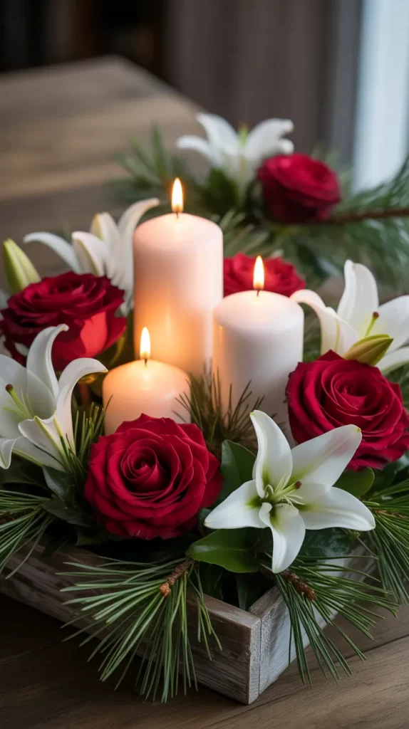 Combine the soft glow of candles with beautiful flowers for a warm and elegant centerpiece. Arrange red roses, white lilies, and pine sprigs around pillar candles in a shallow tray or wooden box.