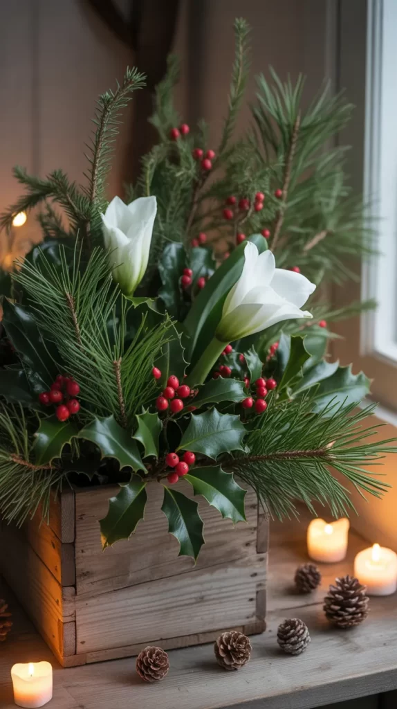 Combine pine, holly leaves, and red berries for a natural, earthy arrangement. Add a few white flowers to brighten it up. Display it in a rustic pot or basket for that authentic woodland feel.