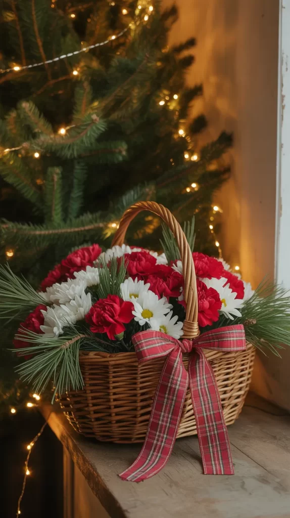 Use a small wicker or wooden basket to hold your holiday flowers. Fill it with red carnations, white daisies, and a few pine sprigs. Add a red plaid ribbon handle for that classic country look.