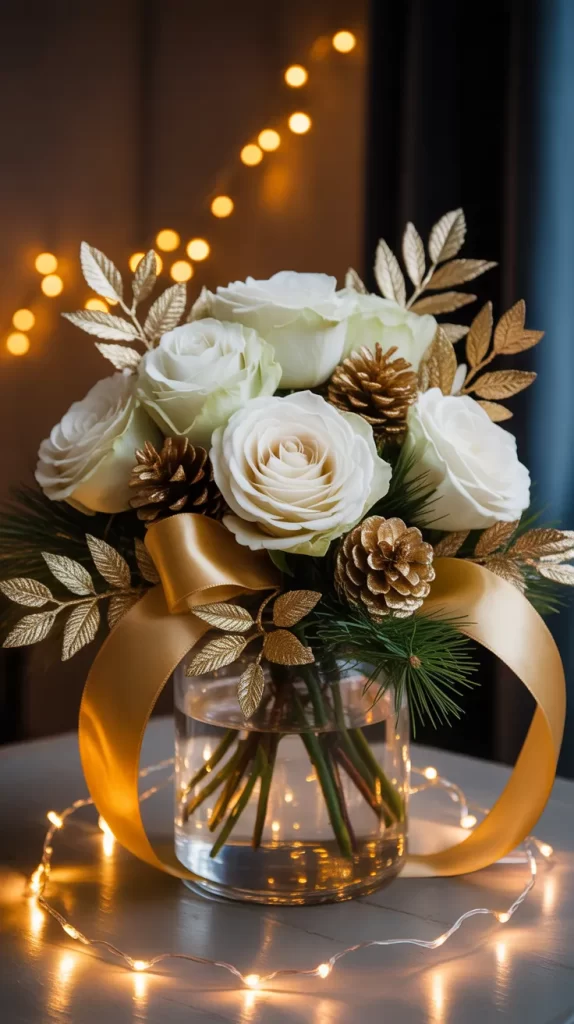Create a luxurious arrangement with golden flowers, glittered leaves, and warm-toned accents. Combine white roses, gold-painted pinecones, and golden ribbon in a glass vase for a glamorous holiday centerpiece.