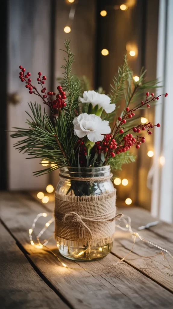 Turn a simple mason jar into a beautiful rustic flower holder. Wrap the jar with burlap or twine and fill it with seasonal blooms like red berries, pine branches, and white carnations. The combination of natural materials gives it a cozy farmhouse vibe.