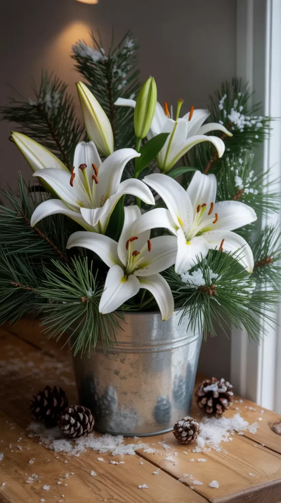 Place this arrangement in a metal bucket or rustic pot for a cozy, woodland charm. It’s simple yet stunning and brings the beauty of snowy outdoors inside your home.