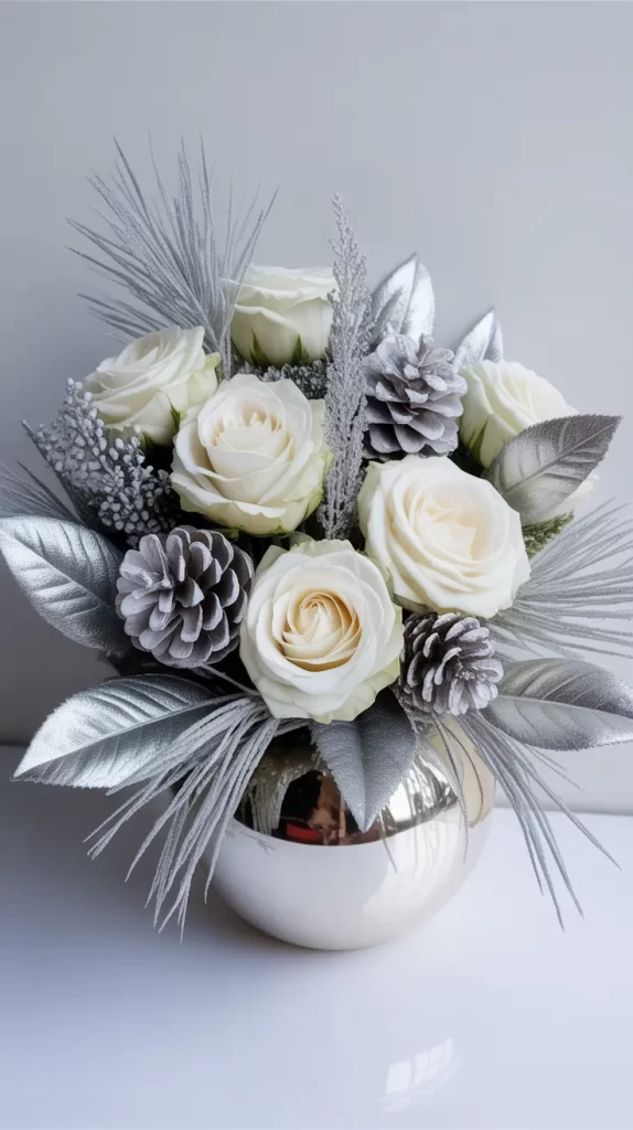 Create a cool, icy theme with white roses, silver leaves, and frosted pinecones. Use a white or silver vase to keep the palette soft and elegant. Add touches of baby’s breath for a snowy effect.