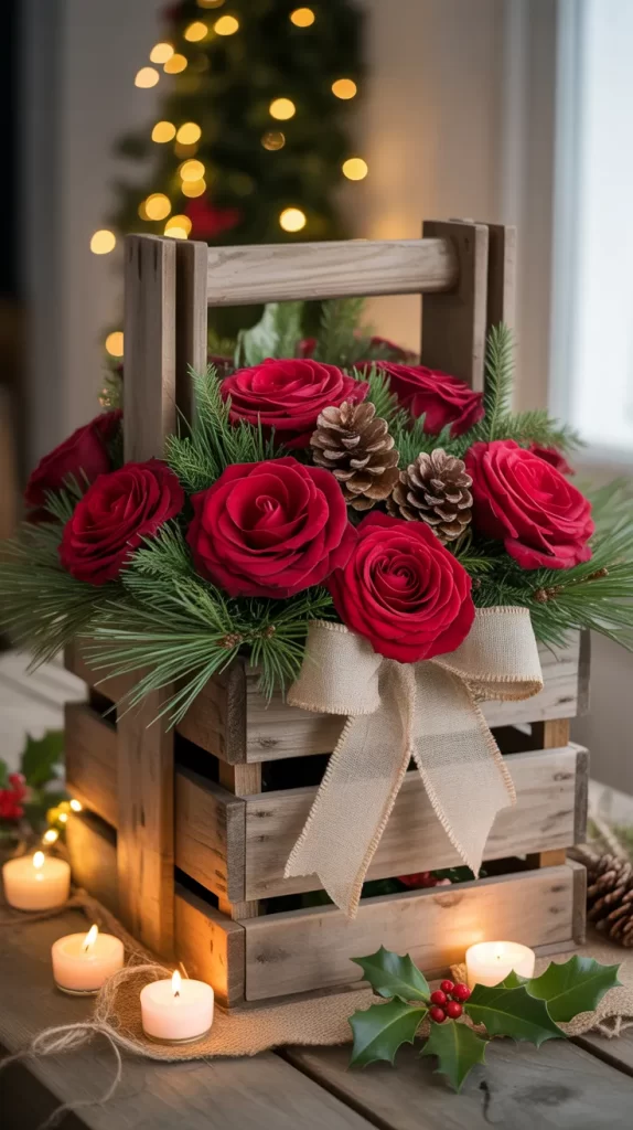 Repurpose a wooden crate into a stunning floral display box. Fill it with red roses, pinecones, and greenery, then tie a burlap ribbon around it.