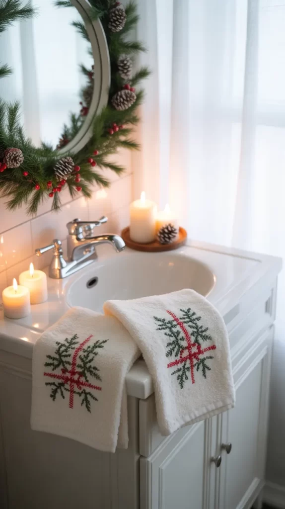 Add subtle Christmas touches to your bathroom! Swap regular towels for holiday-themed ones, and use pine-scented candles.