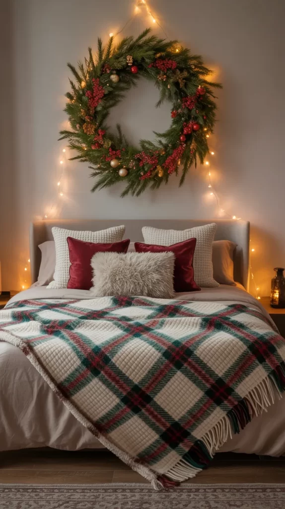 Hang string lights around the headboard and add a small wreath above the bed for an instant holiday mood. The soft glow and cozy textures make bedtime extra magical all season long.