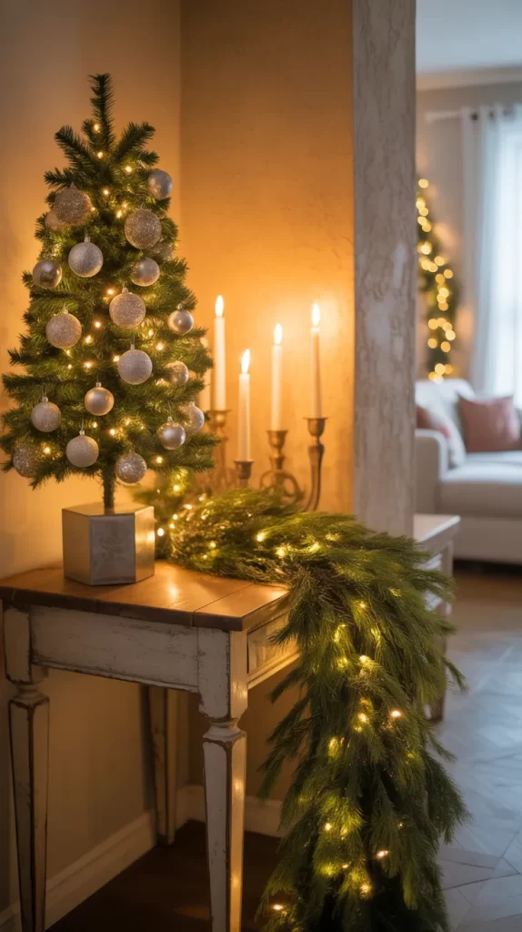 Welcome guests with a glowing first impression! Add a mini Christmas tree by the door, hang twinkling fairy lights, and place a small “Merry Christmas” sign on the wall. You can even use lanterns or candles for a warm, cozy vibe.