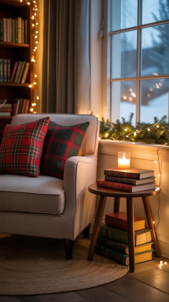 Turn your reading corner into a Christmas escape. Add red cushions, plaid throws, and a string of warm lights.