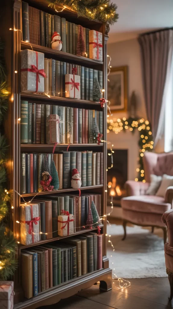 Give your bookshelf a holiday twist by wrapping a few books like presents! Use red, green, and gold paper, and add ribbons or tags.