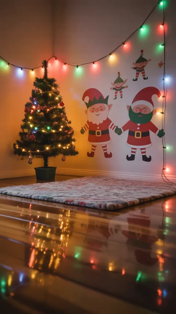 Turn your child’s play area into a mini North Pole! Decorate with wall stickers of Santa, elves, and reindeer. Add a small Christmas tree with soft ornaments they can safely touch