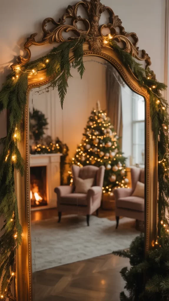 Wrap fairy lights or garlands around mirrors to make reflections shimmer. It’s a simple trick that instantly doubles your holiday glow!
