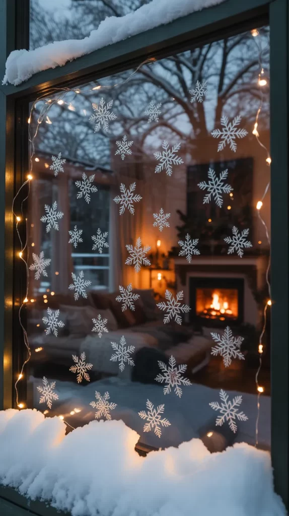 Dress your windows with Christmas clings, snowflake decals, or hanging ornaments. Add LED candles or fairy lights along the sill for a glowing nighttime view.