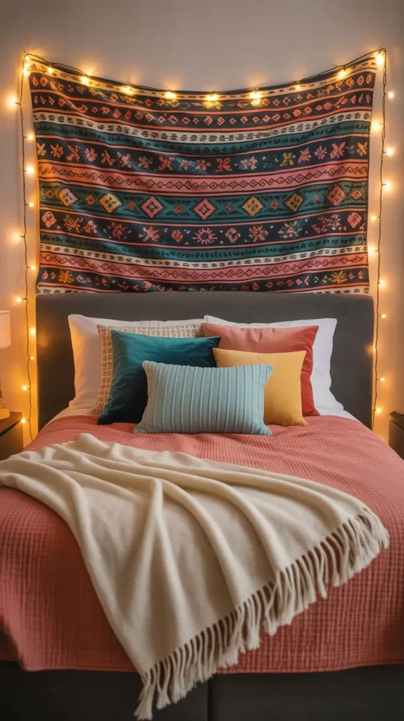 Add life to your dorm walls with bright, patterned tapestries. Choose bold colors like pink, turquoise, or yellow to create a focal point. Tapestries are inexpensive, lightweight, and easy to hang, making them perfect for college living. They can cover dull walls and instantly bring warmth to your space. Pair with fairy lights for a cozy vibe. You can also switch them seasonally or rotate patterns to keep your room feeling fresh.