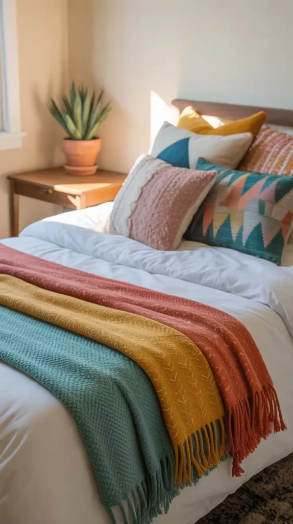 Add pops of color with throw blankets. Layer them on your bed, chairs, or window seat. Choose bright colors or patterns that complement your bedding. Throws not only add warmth but also style, giving your dorm a cozy and inviting feel. They’re also easy to switch out seasonally for variety.