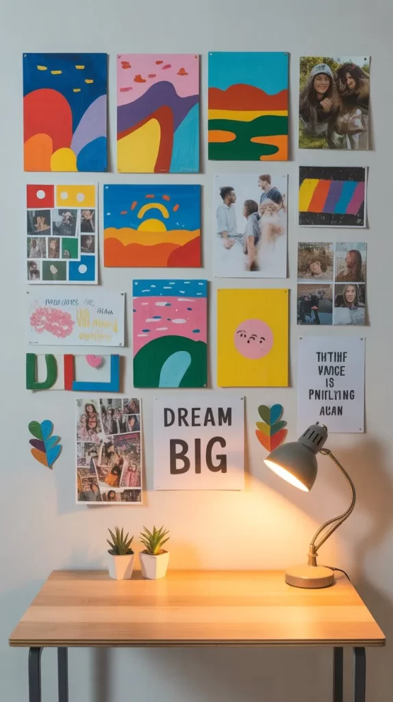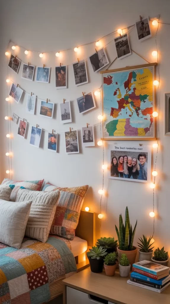 Display your favorite memories with a string photo display. Clip photos, postcards, or small prints to colorful string lights or twine. This creates a personal gallery that brightens your dorm. Use multicolor clips or frames to add extra vibrancy. It’s a simple DIY project that brings nostalgia and charm to your space.