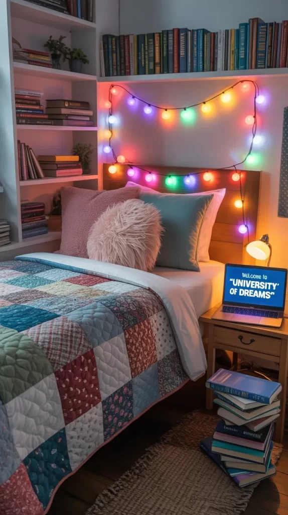 Fairy lights are perfect for adding color and warmth. Choose multicolor LED lights or string lights with small, colorful bulbs. Hang them around your bed, windows, or walls to create a magical glow. They’re ideal for creating a cozy study or relaxation corner. You can also drape them over shelves or mirrors to make your dorm feel whimsical and inviting.
