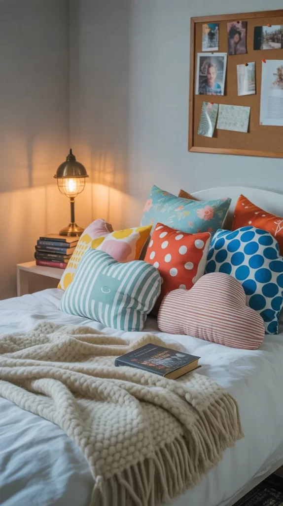 Decorate your bed or chairs with bold statement pillows. Mix colors, patterns, and textures to make your space lively. Pillows are an easy way to change the look of your dorm without permanent changes. Choose pillows with fun prints, motivational quotes, or quirky designs. They also provide comfort for reading, studying, or lounging.