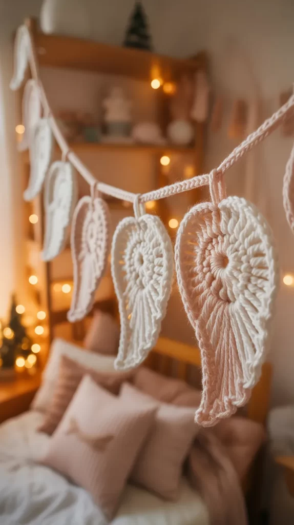 A garland of small angel wings brings a gentle, peaceful feeling. You can use soft white yarn or pastel shades for a calm, dreamy look. This design is perfect for children who enjoy quiet, comforting holiday spaces.