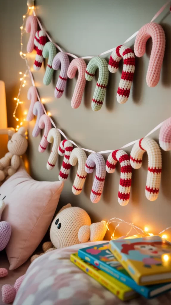 A candy cane garland is classic but still playful, especially when made in fun unexpected colors like pink and teal. These soft yarn candy canes won’t break, making them perfect for kids’ rooms. You can alternate colors to create a bright and festive pattern that works well on door frames and bookshelves.