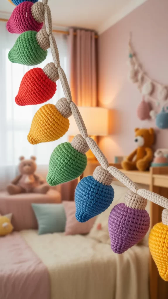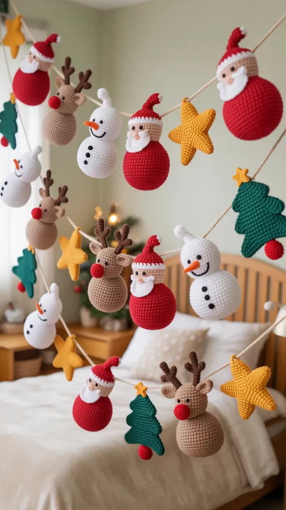 A smiling crochet star garland brings warmth and charm into your child’s room. Each star can have embroidered eyes and a small smile to create a friendly character that children will adore. Use bright colors like aqua, lavender, mint, and peach for a soft and dreamy look. This garland feels magical and can stay up even after Christmas for year-round joy.
