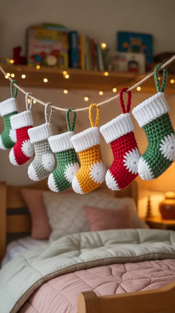 Tiny crochet stockings look adorable when strung together in a garland. Each stocking can be a different color or pattern, allowing kids to choose their favorites. You can hang the mini stockings across the wall, above the closet, or on a playroom shelf. These stockings add a “Santa is coming!” feeling to the room.