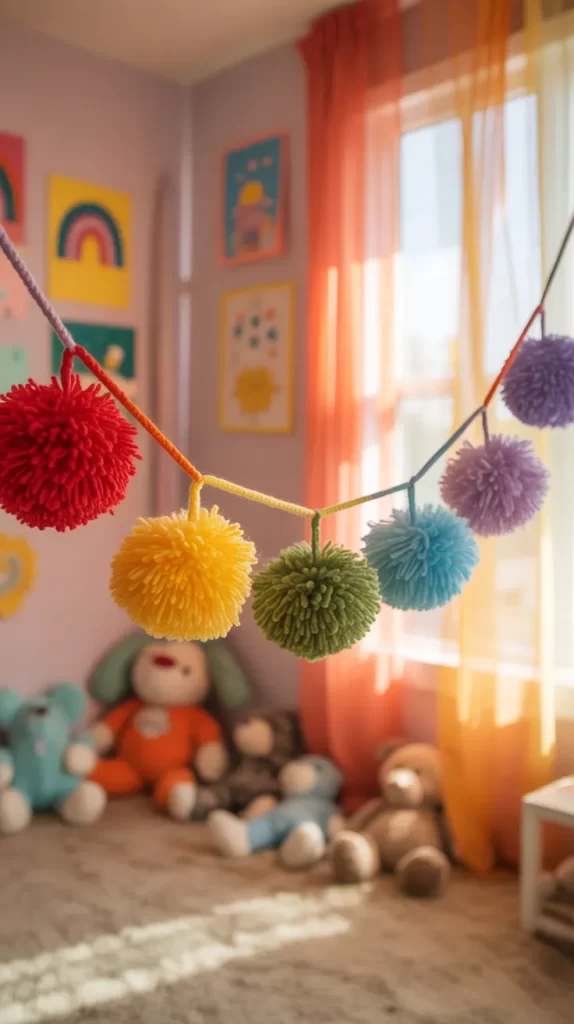 Kids love pom-poms because they are playful and fuzzy. Parents appreciate that this décor is simple, safe, and lightweight. It is ideal for draping over curtains, bedposts, or across walls. It instantly brightens a room and feels joyful and fun, making it a great decoration for any playful holiday theme.