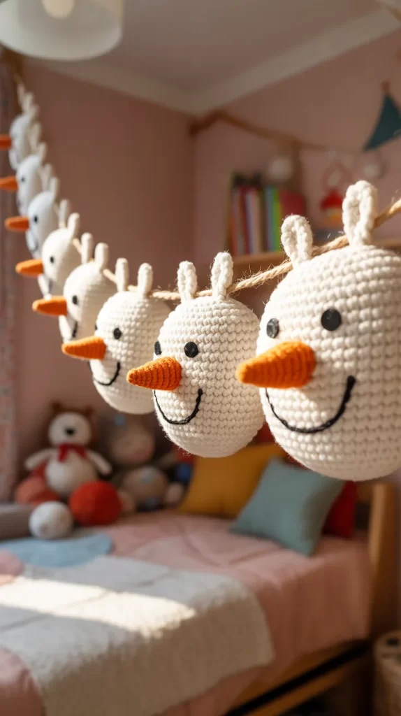 This garland fits well above the bed or across a study desk. It is also great for children who enjoy winter stories. You can even add tiny scarves made from yarn scraps to give each snowman a unique personality.