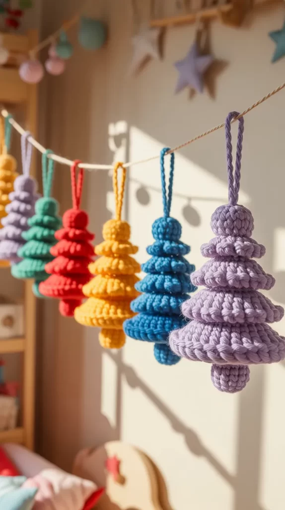 A rainbow crochet Christmas tree garland is perfect for brightening up a child’s room. Instead of the traditional green, you can create little trees in fun colors such as pink, yellow, blue, purple, and orange. These mini trees look cheerful and playful, helping make the holiday season feel lighthearted and joyful. You can hang them above a bed, across a window, or on a playroom wall to add festive spirit.