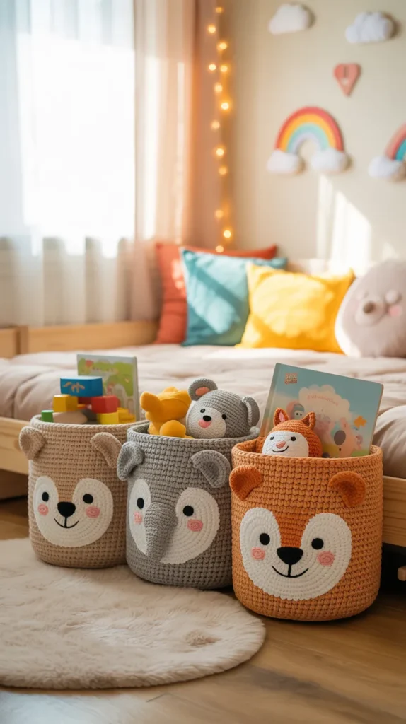 Animal face crochet baskets are playful and practical for children’s rooms. Think bears, bunnies, foxes, cats, or lions with cute ears and stitched faces. Kids enjoy putting toys away when storage feels fun. Use these baskets for stuffed animals, blocks, books, or art supplies.
