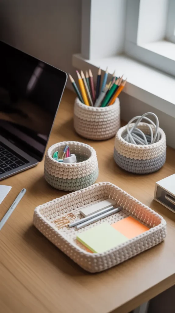 A trio of small crochet baskets is perfect for desks and home offices. Use one for pens, one for chargers, and one for notes or clips. Bright or coordinated colors can make workspaces feel more creative and less stressful. Organized desks often improve focus and save time.