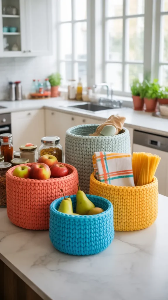 Bright fruit-inspired colors like lemon yellow, orange, strawberry red, and lime green make crochet baskets fun for kitchens. Use them to store napkins, tea towels, onions, garlic, snacks, or packaged goods. These cheerful colors can brighten shelves and counters while helping everything stay organized.
