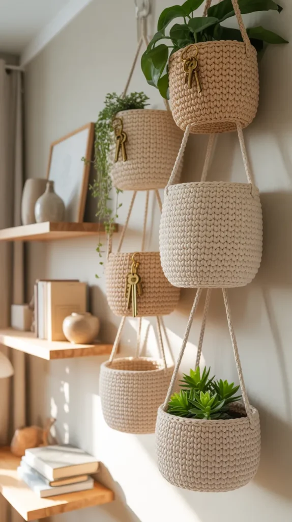Choose sturdy yarn and a strong loop handle. This idea is very budget-friendly because it uses wall space instead of buying larger furniture. It is also easy to move when your layout changes. For renters and small-space living, hanging crochet baskets are a practical and cost-effective storage solution.