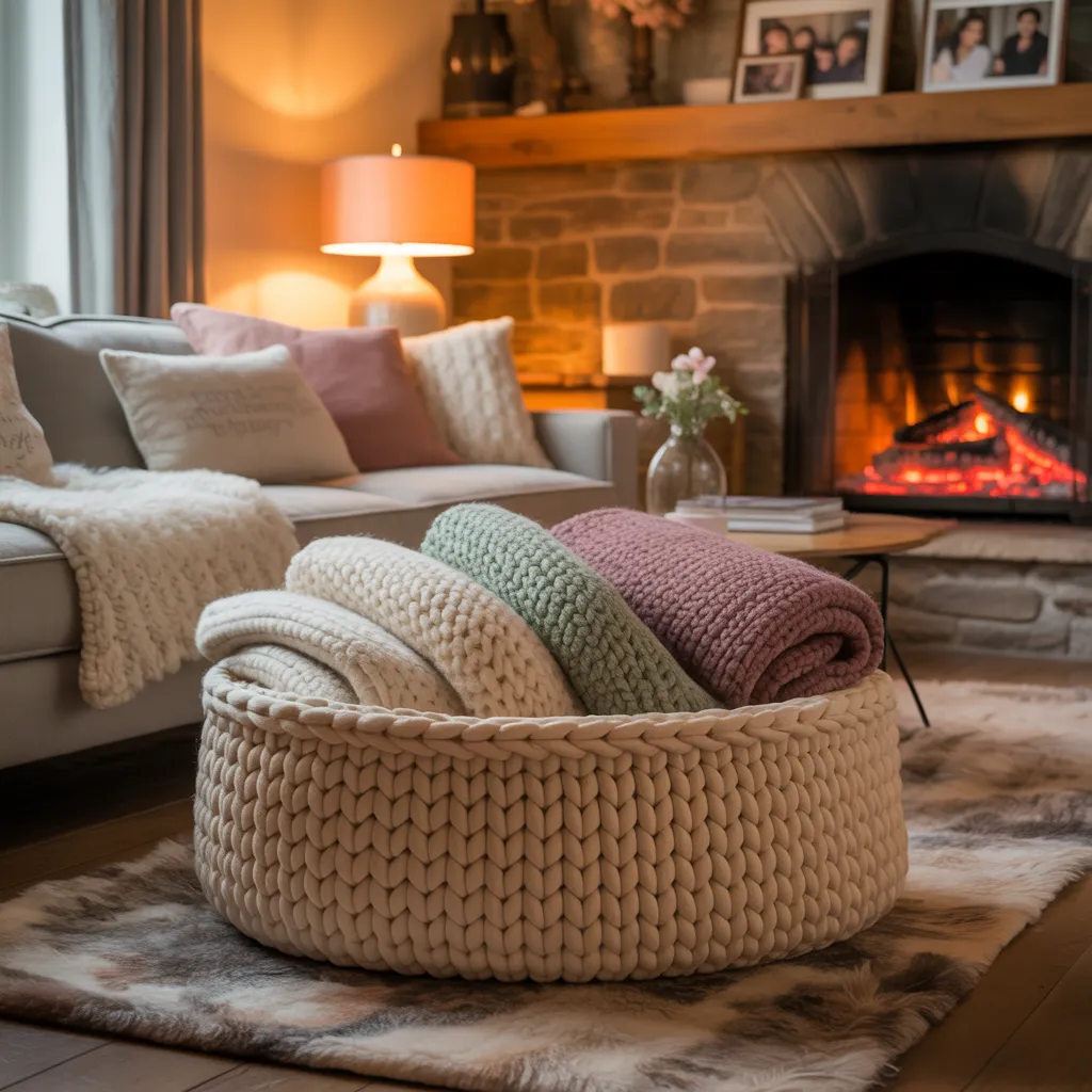A jumbo crochet storage basket is perfect for holding large blankets, comforters, and cushions. Use bold colors like navy, cream, charcoal, or multicolor blends for a statement piece. Place it near the sofa, fireplace, or bed so blankets are easy to grab on cool evenings. It turns bulky items into part of the decor.
