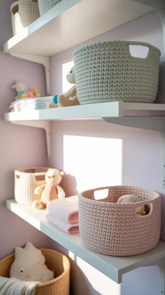 Pastel crochet baskets are perfect for nursery storage because they feel soft, calm, and welcoming. Use shades like blush pink, mint green, baby blue, cream, and lavender. A matching set of small and medium baskets can organize diapers, baby socks, toys, lotions, and books. They help keep changing tables and shelves tidy while adding a sweet handmade touch.