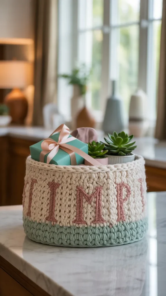 A personalized crochet basket with a stitched name or initials makes a thoughtful gift. Use it for baby showers, birthdays, weddings, or housewarming presents. The basket can hold beauty products, books, toys, or keepsakes. Personalized storage feels meaningful and useful at the same time.