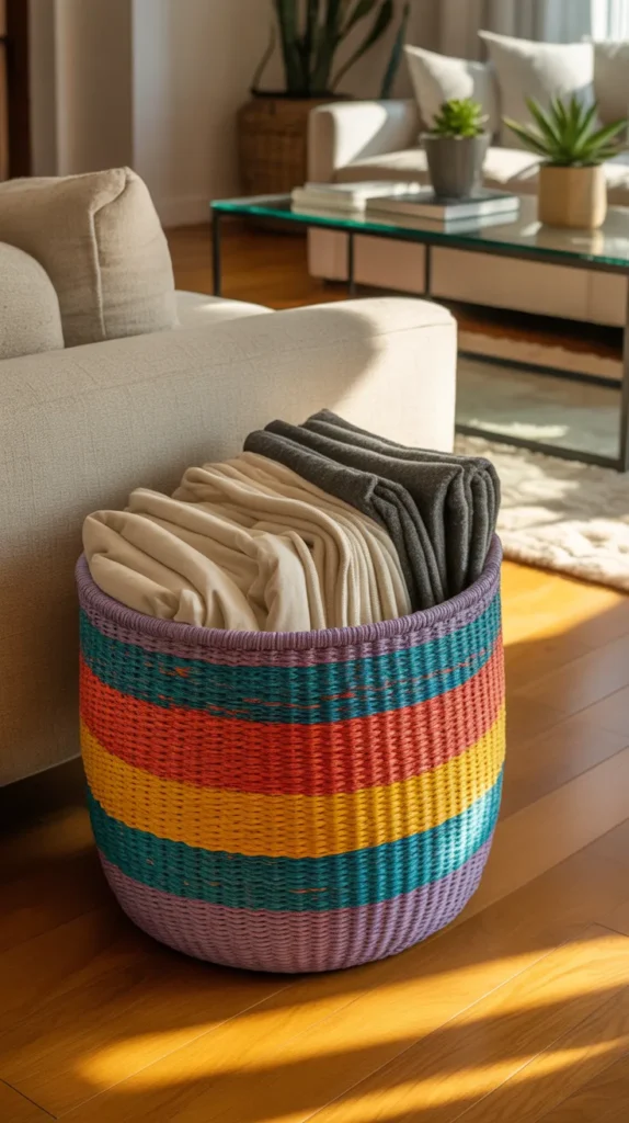 A rainbow stripe crochet basket brings instant joy to a living room. Bright rows of red, blue, yellow, green, and soft neutrals create a cheerful look that works well beside a sofa or reading chair. Use it to store throw blankets, magazines, remote controls, or kids’ toys. The colorful stripes make clutter look organized while adding a playful design touch. This is a cost-effective way to refresh your space without buying expensive decor pieces.