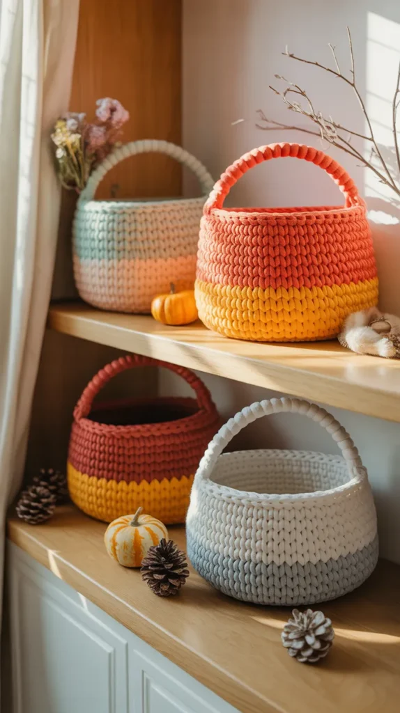 Create baskets for every season using changing colors. Use pastels for spring, bright shades for summer, orange and brown for fall, and deep green or red for winter. Rotate them through the year to refresh your decor while keeping storage useful.