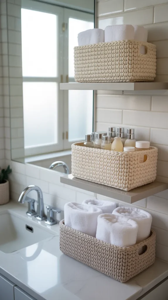 Soft white, sand, aqua, or gray crochet baskets create a spa-inspired bathroom look. Use them to hold rolled towels, soaps, skincare products, toilet paper, or washcloths. They make countertops and shelves feel cleaner and more organized while adding texture.