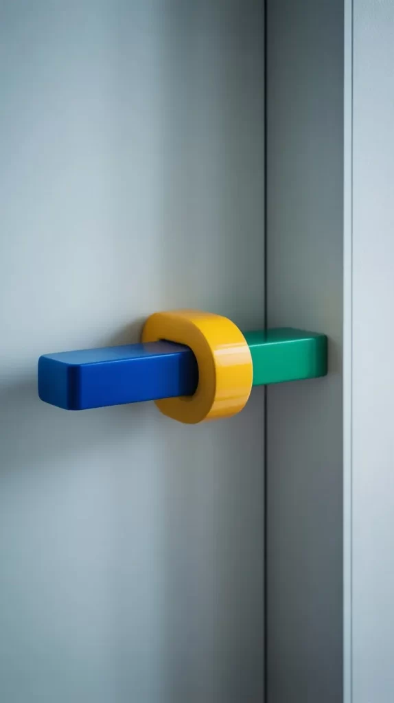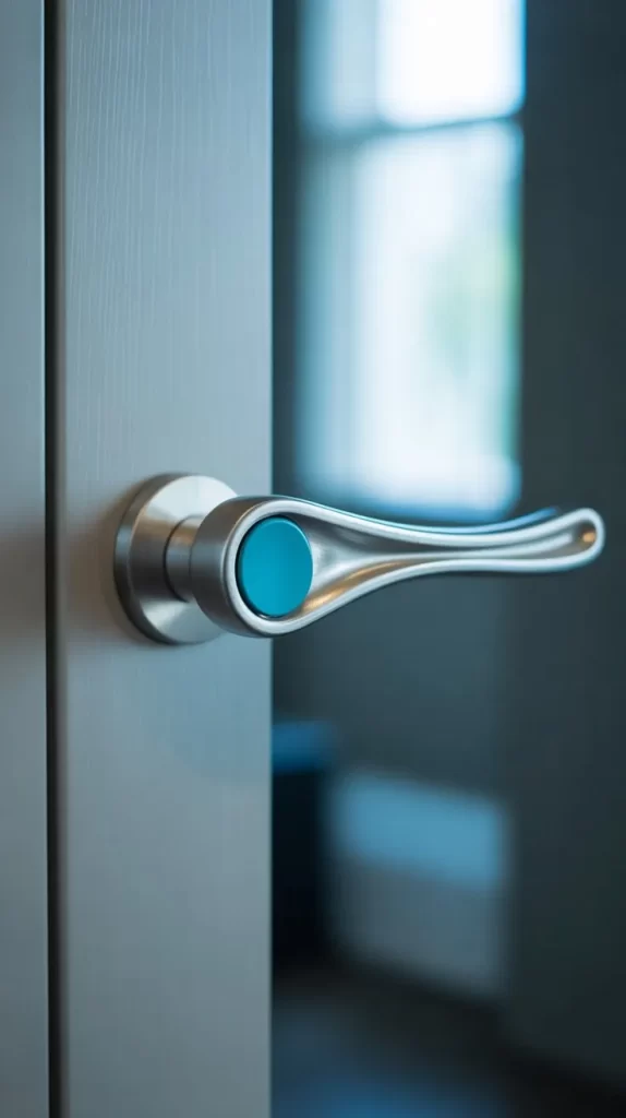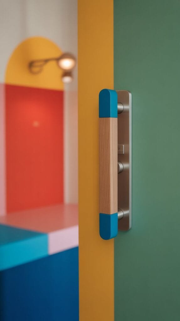Sleek metallic handles paired with colorful accents provide a balance of sophistication and fun. For instance, gold or silver handles with a hint of turquoise or coral add vibrancy while keeping a modern edge. Ideal for living rooms, kitchens, or offices, these handles make doors look trendy and luxurious.