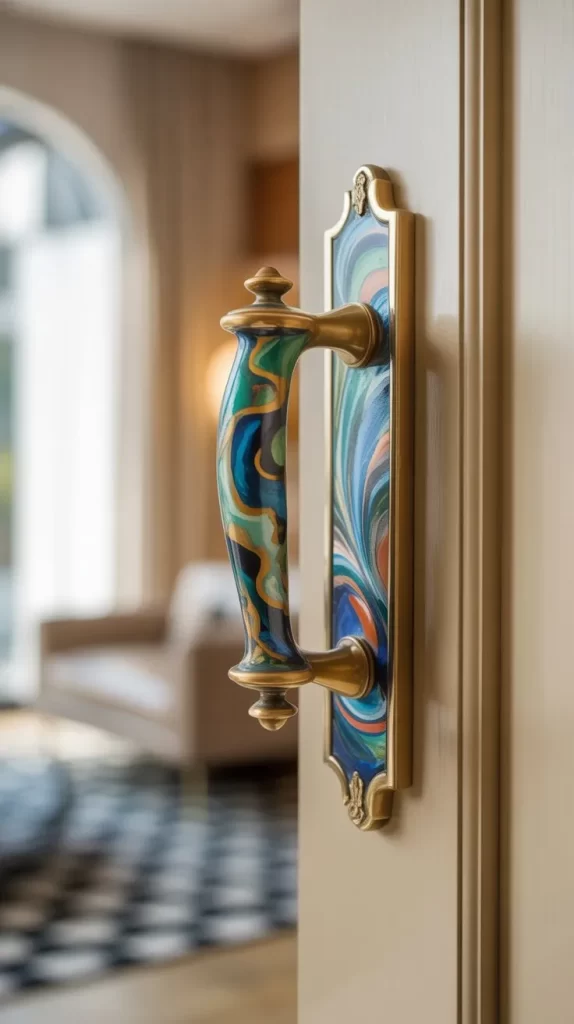 Custom hand-painted handles turn doors into unique art pieces. Use abstract designs, brush strokes, or patterns in bright, contrasting colors. These handles make interiors creative and lively while reflecting personal style. Ideal for living rooms, studios, or bedrooms.