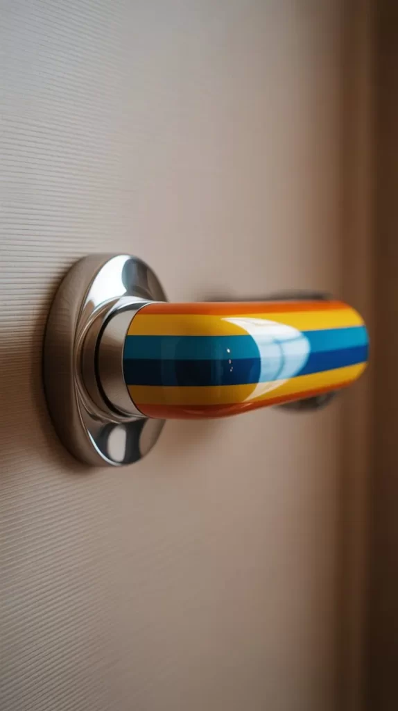 Handles with horizontal or vertical stripes in multiple colors add a fun, artistic look. Ideal for doors in creative studios, kids’ rooms, or hallways, these striped handles turn ordinary doors into decorative elements. They create visual interest and match playful or eclectic interiors.