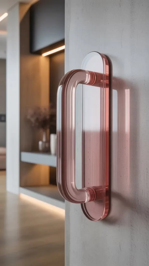 Clear acrylic handles in bright hues add a contemporary and futuristic touch. The transparency combined with colorful undertones makes them visually striking without being heavy. Perfect for minimalist or modern interiors, these handles let the door design shine while adding playful color.