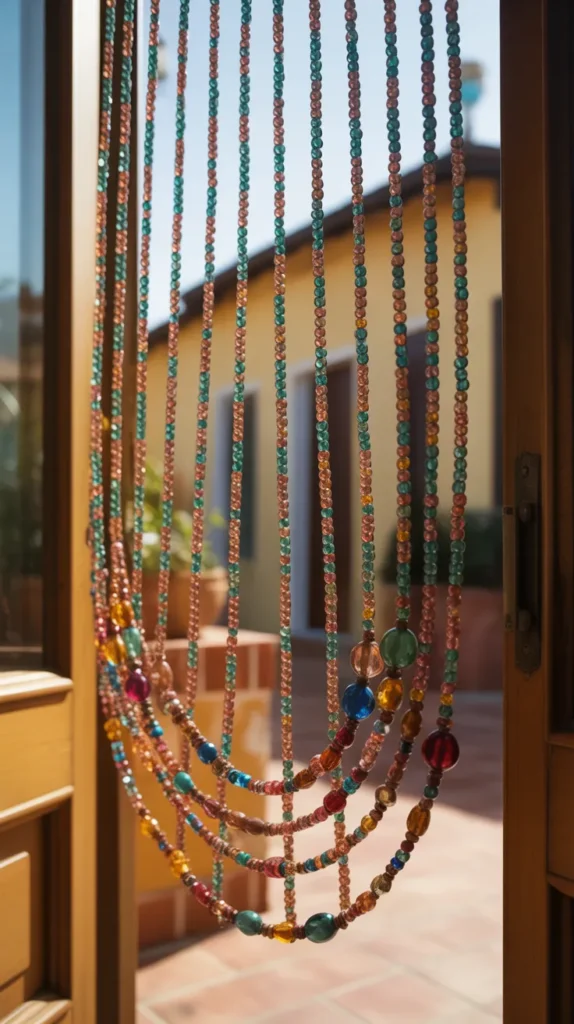 Beaded door hangings use strings of colorful beads arranged in beautiful patterns. Glass, wooden, or plastic beads in shades of blue, orange, green, and gold create a lively look. When light hits the beads, they shine softly and make the entrance feel special.