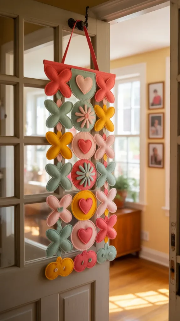 Felt door hangings use soft felt shapes like flowers, hearts, or leaves in bright colors. They are safe, lightweight, and perfect for family homes.