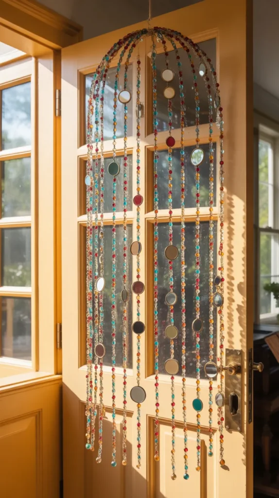 Mirror door hangings with colorful beads reflect light and make the entrance feel brighter. Small mirrors combined with beads create a decorative and eye-catching look.
