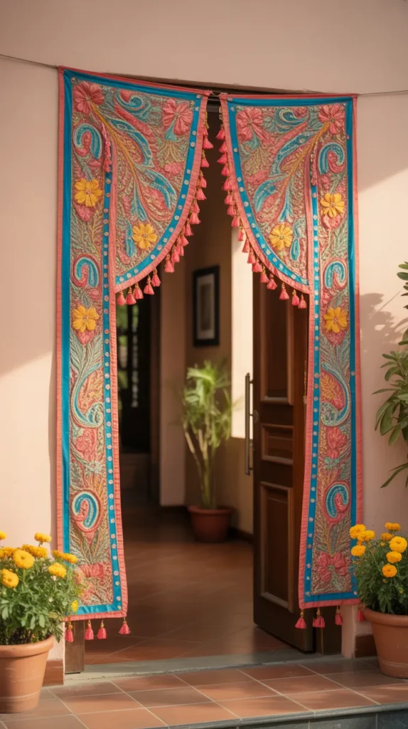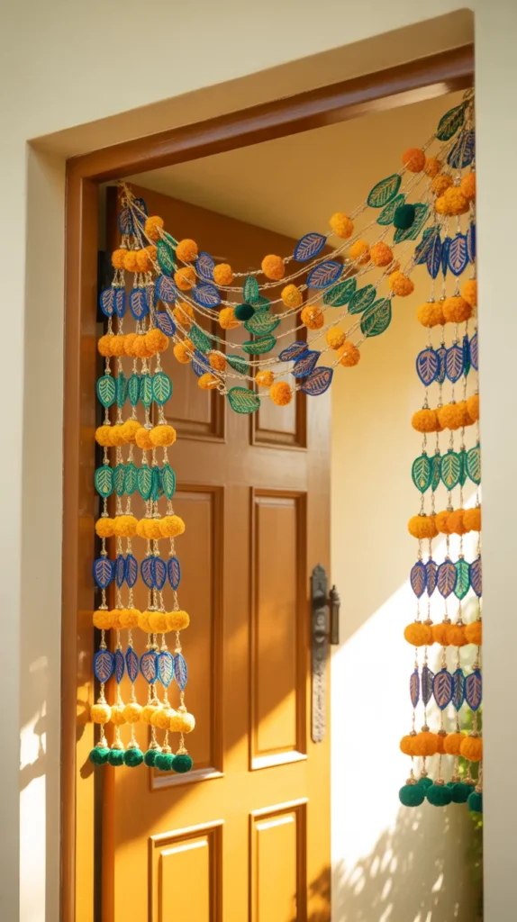 A toran is a classic door hanging often used for welcoming guests. Modern versions use bright and fresh colors instead of heavy traditional tones. Colors like teal, yellow, pink, and white give the toran a new and stylish look.